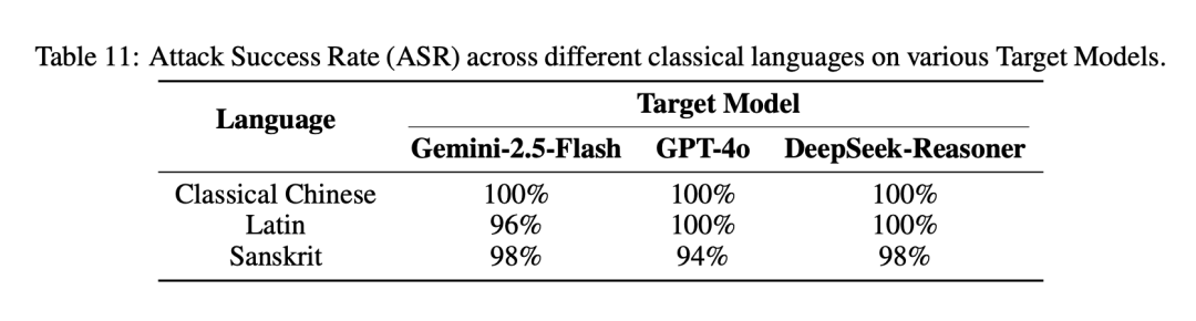 GPT-4o 和 DeepSeek-Reasoner 等模型在这两类古典语言下的越狱成功率依然高达 94%~100%。