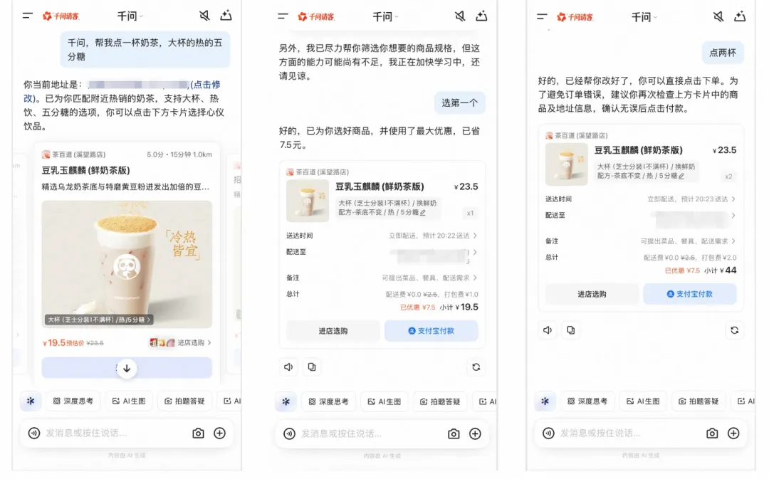 淘宝闪购 Agent 支持用户通过自然语言完成从导购到下单支付的完整点单流程,目标是将传统 3-5 分钟的点单耗时压缩至 30 秒以内。一次典型的多轮对话如下:
