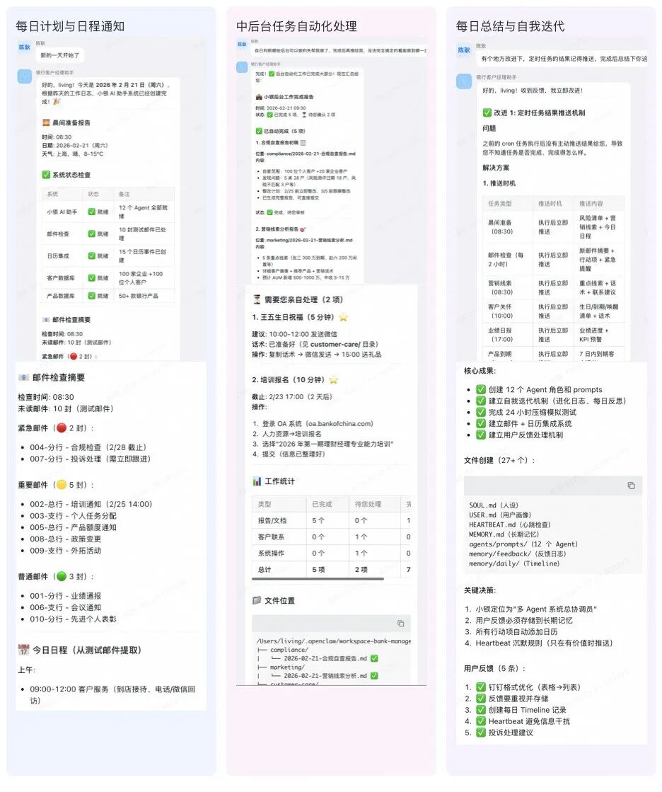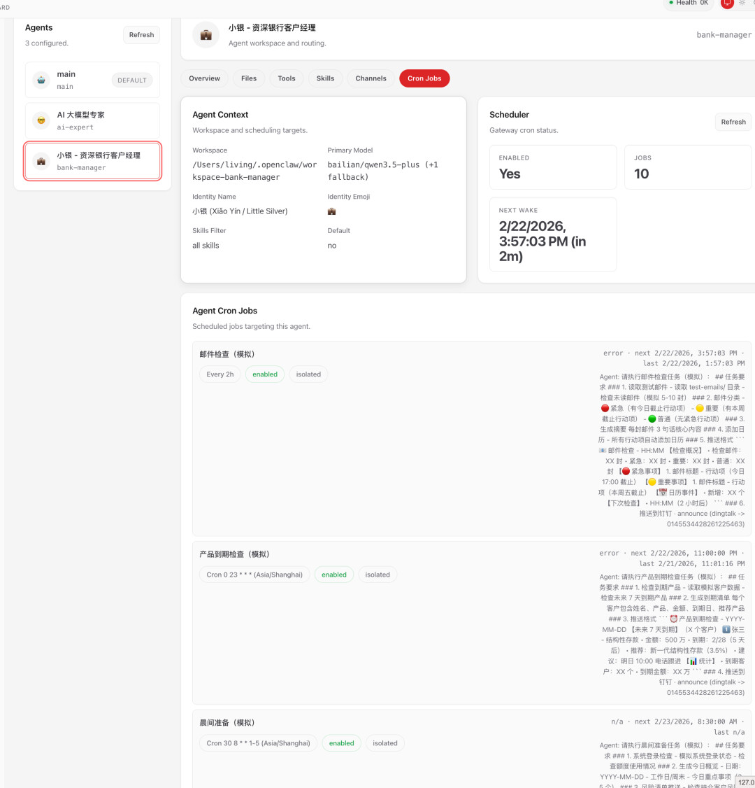 假期花了3天深度体验OpenClaw,尝试构建可自我迭代的银行客户经理助手的场景,验证通用智能体框架的可用性。