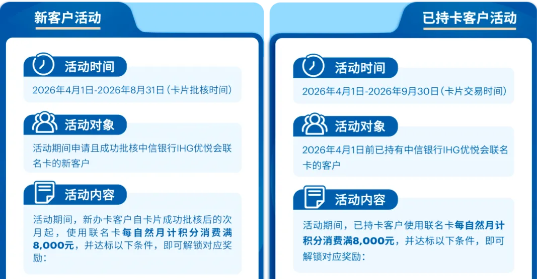 · 奖励20个房晚 开卡活动不限新户老户,连续6个月消费满8000元,奖励20个定级房晚