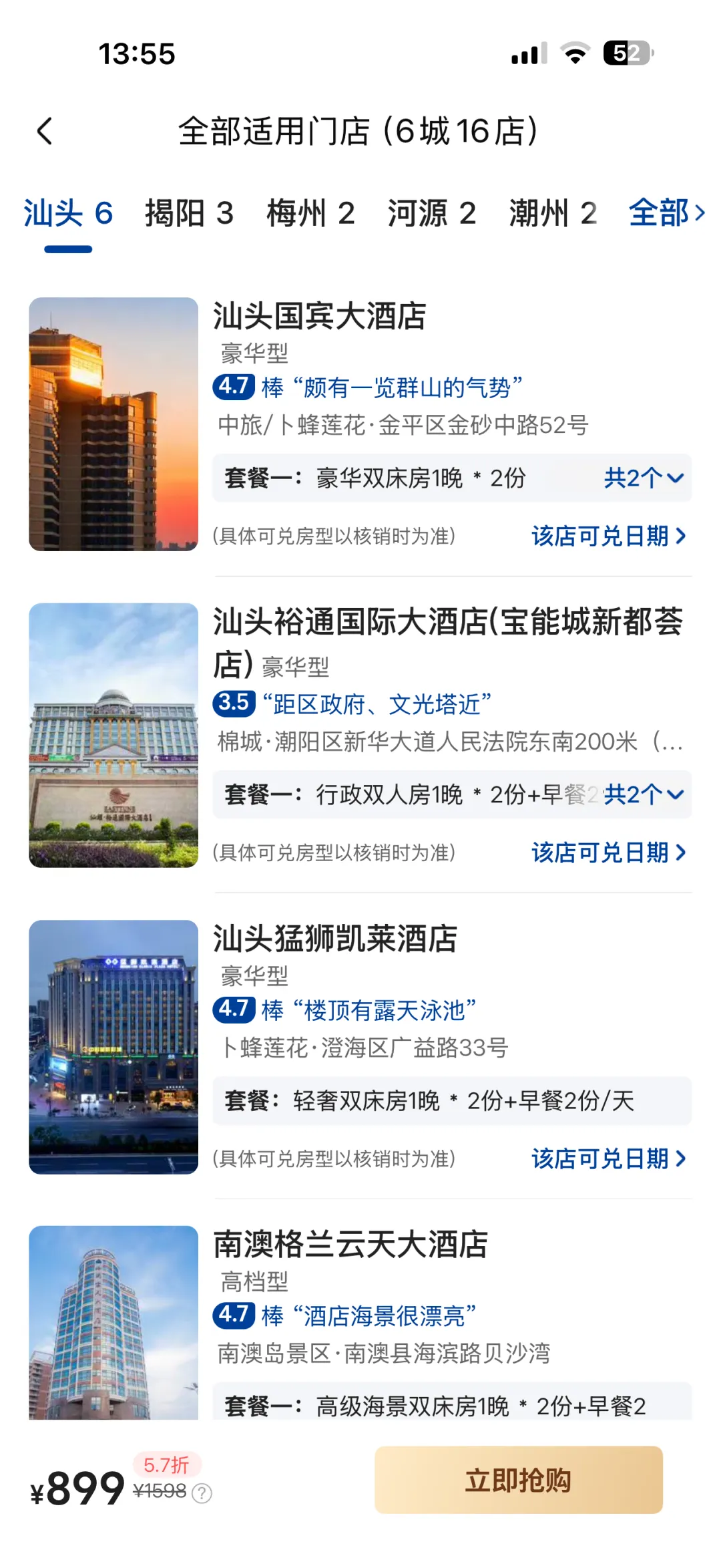 可以用满998-100的券,券后449元/晚。共汕头、汕尾、揭阳、潮州、梅州和河源的16家酒店可用。