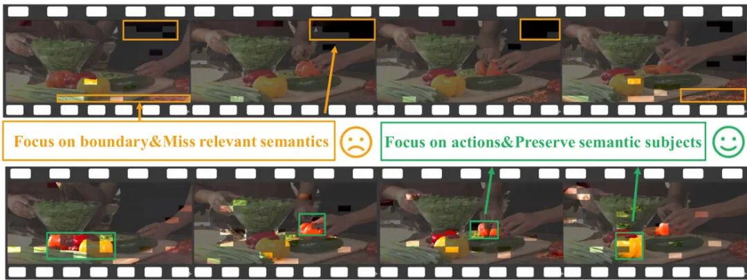 这是最常用的Token精简方案,通过注意力分数筛选保留Token,但存在严重位置偏见:画面边缘的静止背景(墙壁、天空等)因靠近查询位置易被保留,而人物面部、关键动作等核心语义Token反而被剪掉,高剪枝率下模型准确率大幅下滑,属于“盲目减负”。
