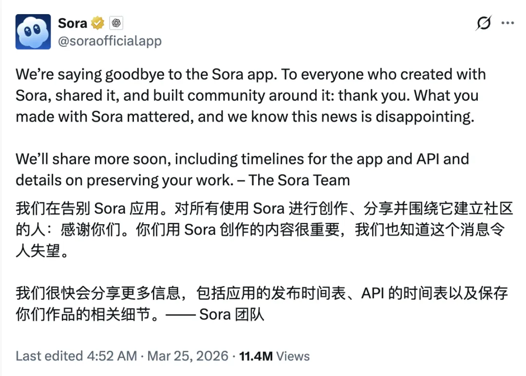 OpenAI Sora 宣布关停,彻底关停。