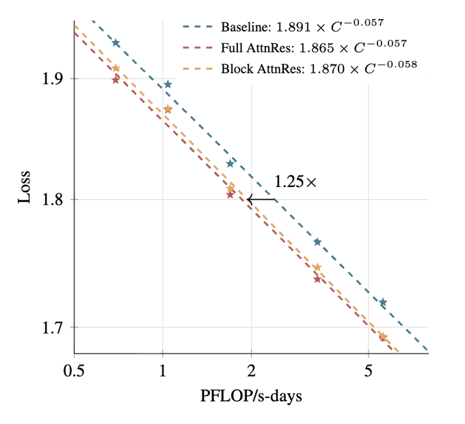分块注意力残差连接,花同样的钱,能达到传统残差连接 1.25 倍算力才能达到的效果