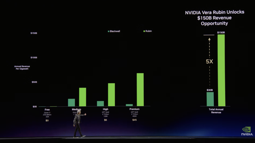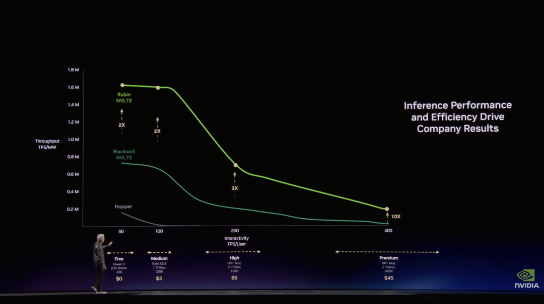 黄仁勋表示,这种极致的软硬件协同设计还能显著提升现有系统性能。例如在部分 AI 推理平台中,仅通过更新 NVIDIA 软件栈,就能将生成速度从 约 700 token/ 秒提升至接近 5000 token/ 秒,性能提升约 7 倍。