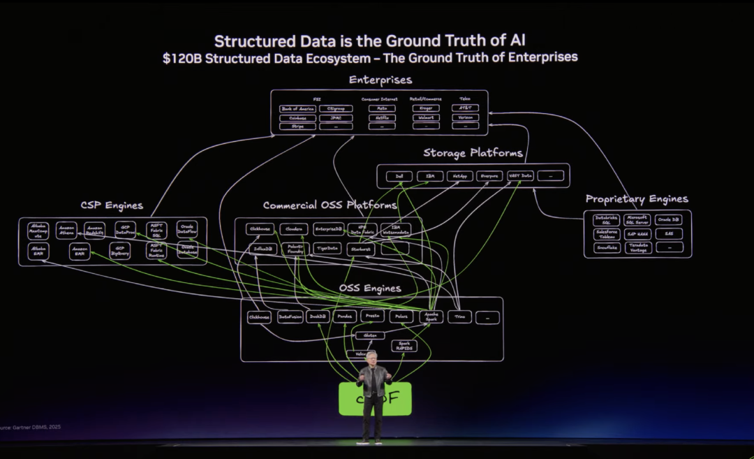 黄仁勋指出,长期以来企业计算的基础建立在 结构化数据 之上。无论是 SQL、Spark、Pandas 等技术体系,还是诸如 Snowflake、Databricks、Amazon 的 EMR、Microsoft 的 Azure Fabric,以及 Google 的 BigQuery 等大型数据平台,本质上都在处理一种核心数据结构——数据框(DataFrame)。这些数据框可以被理解为巨型电子表格,承载着企业运营和业务决策所依赖的关键信息,是企业计算体系中的“事实来源”(ground truth)。