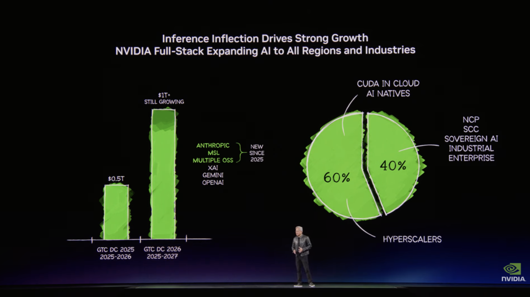 在英伟达的业务中,60% 来自顶级云服务商(Hyperscalers),不仅支持其内部 AI 消费(如推荐系统、搜索向大模型的迁移),更通过英伟达的生态系统加速每一家 AI 实验室。另外 40% 则遍布区域云、主权云、企业级服务器及工业自动化。