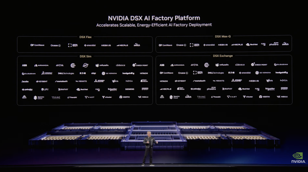 黄仁勋表示,NVIDIA 及其合作伙伴正在全球范围内加速建设 AI 基础设施,以实现更高水平的可靠性、效率和计算吞吐能力。这一体系的核心平台就是 NVIDIA 新推出的 NVIDIA DSX——一个面向“AI 工厂”的基础设施平台。