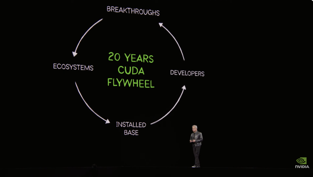 “CUDA 的安装基数,是飞轮加速的原因。安装基数吸引开发者,开发者创造新算法,带来技术突破——比如深度学习,还有很多其他领域。这些突破催生全新市场,围绕它们形成新的生态,更多公司加入,进而扩大安装基数。”