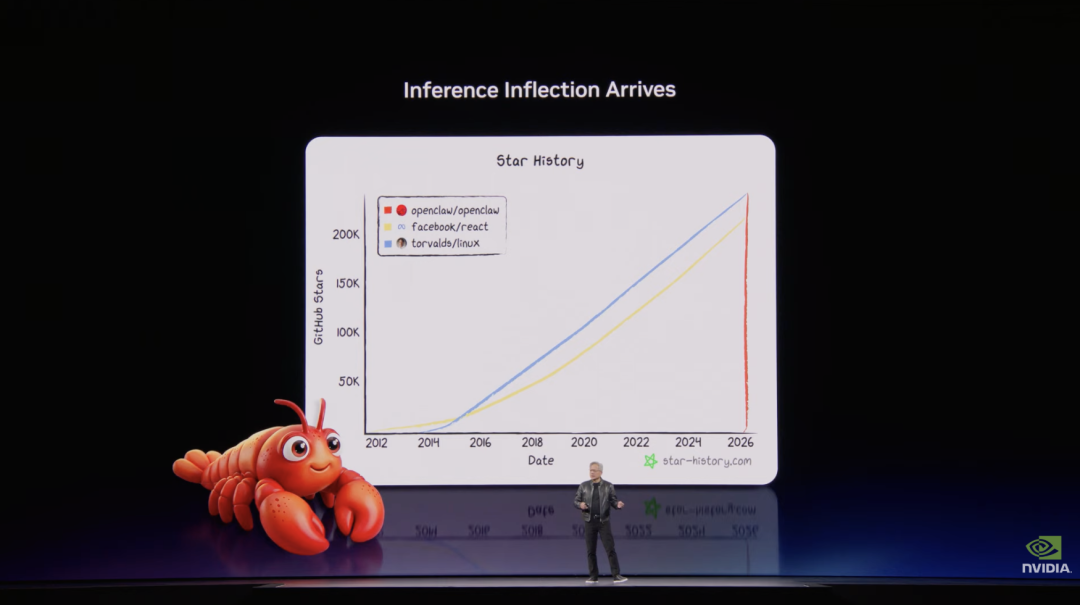 整场演讲中对软件开发者影响最深远的部分是老黄对于最近爆火的“龙虾”现象的评论。黄仁勋高度评价了由 Peter Steinberger 创建的开源项目 OpenClaw。