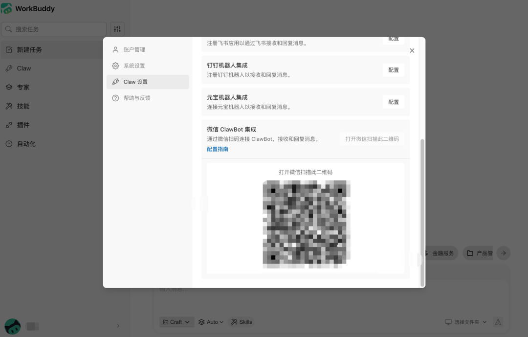 并且,在微信 ClawBot 插件上线之后,WorkBuddy 选择第一时间跟进适配。现在,在电脑端打开 WorkBuddy,进入「Claw 设置」,选择「微信 ClawBot 集成」并点击配置,扫码即可一键完成绑定。