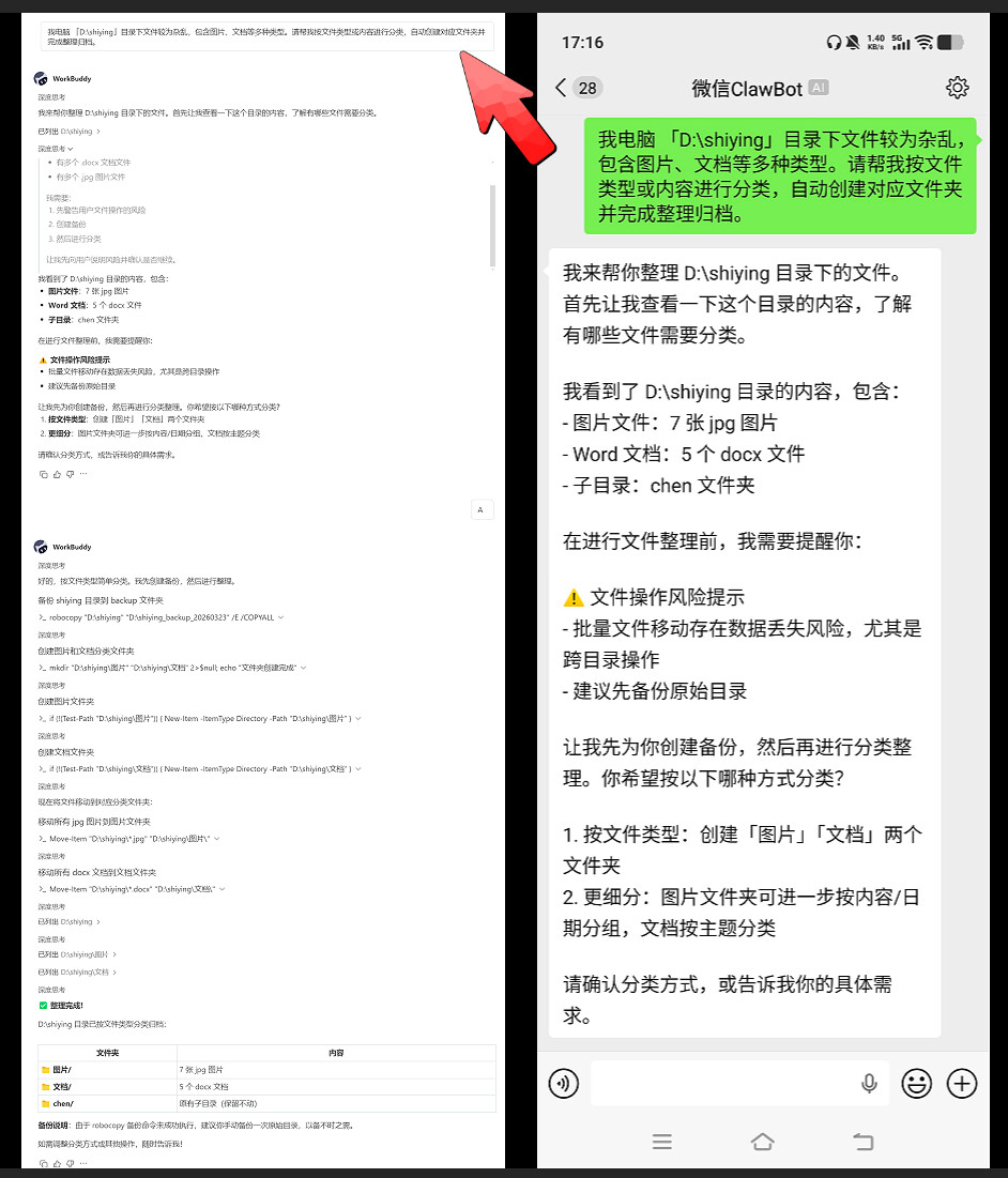 接下来,我们通过微信 ClawBot 远程操控电脑,整理杂乱的文件。