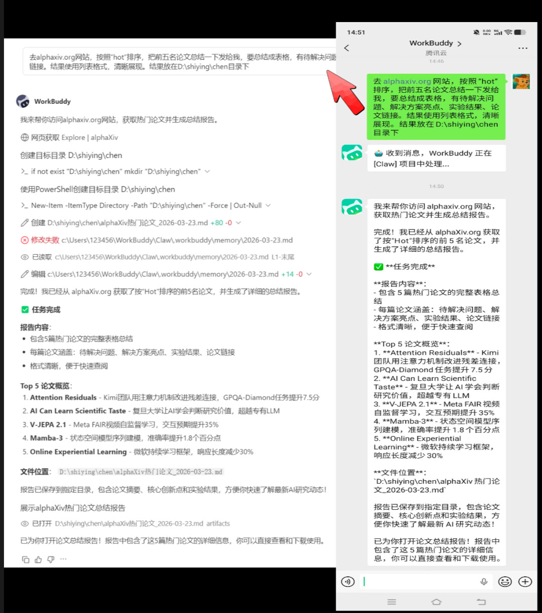 只见手机端刚把指令发出去,电脑那头就已经开始自己干活了:自动定位文件、打开确认、并发送邮件,一气呵成。你这边还在聊天,邮箱文件就已经收到了。