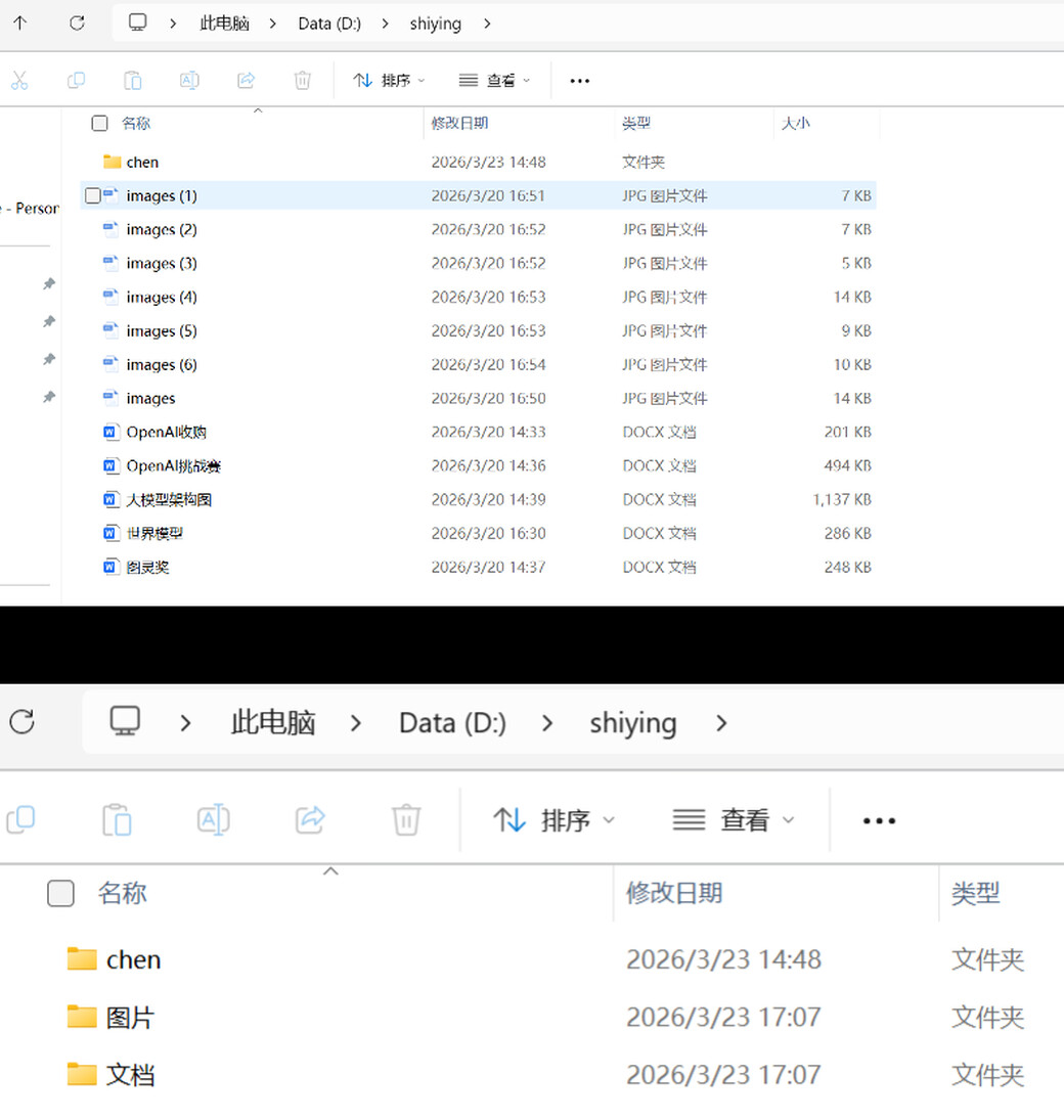 输入提示词:「我电脑「D:\shiying」目录下文件较为杂乱,包含图片、文档等多种类型。请帮我按文件类型或内容进行分类,自动创建对应文件夹并完成整理归档。」