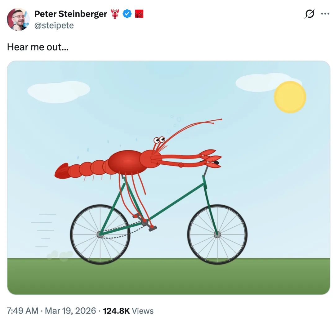 几天前,OpenClaw 创始人 Peter Steinberger 发了一张意味深长的迷因:小龙虾骑上了自行车,看起来不是那么优雅,甚至有点笨拙,但它确实在往前跑。正如当下这波 Agent 浪潮,一切也许还没有完全对齐,但已经动起来了。