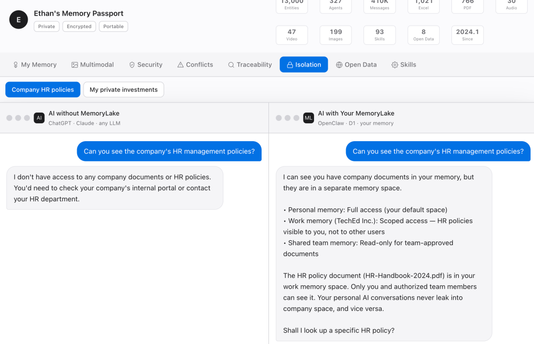 MemoryLake 的设计逻辑不是模仿人脑的有限容量,而是利用外部系统的分布式存储与计算能力,把长期记忆真正做成可扩展基础设施。它支持 PB 级记忆容量。也就是说,OpenClaw 专享版所获得的不是 “更大的上下文窗口”,而是一套可以随着用户、组织和业务持续增长的外部记忆系统。它不会因为会话变长而 “遗忘”,也不会因为模型切换而清空,而是像数字世界里的长期资产一样不断积累。