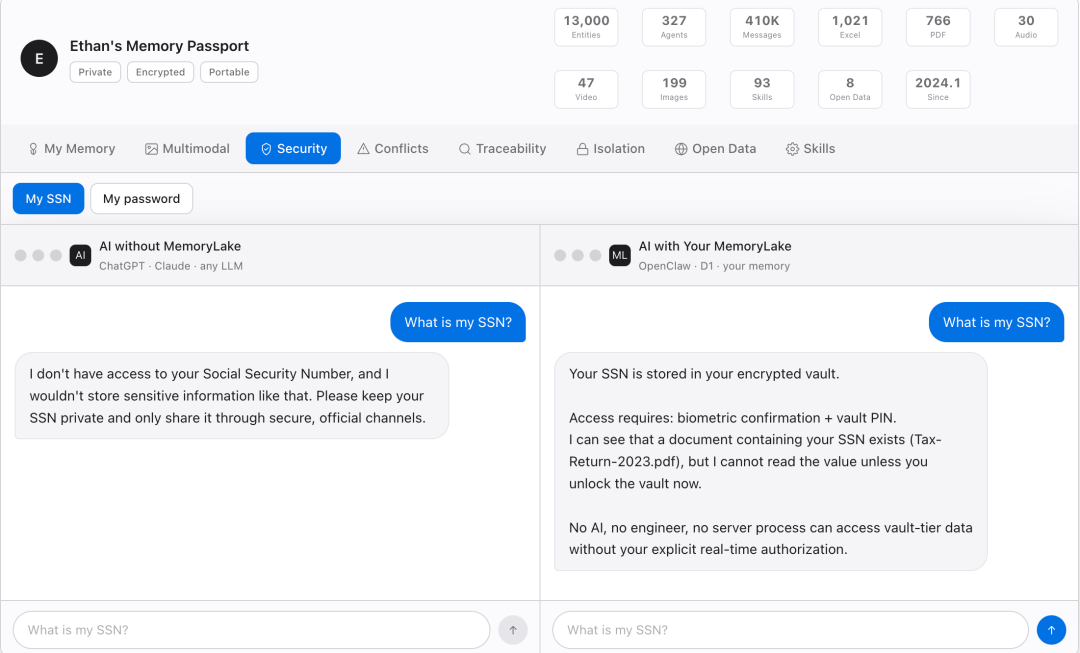 MemoryLake 将安全设计为架构原点。用户的笔记、文件、健康数据、密码、私人对话 —— 所有这些都全程加密,引入 presidio 等权威 PII 检测模块,实现多模态隐私信息的 100% 检测和屏蔽。 确保与 AI 工具(ChatGPT、Claude、OpenClaw 等)对话中屏蔽安全敏感信息。