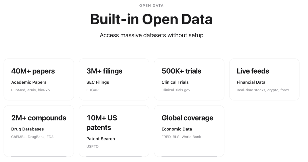 MemoryLake 内置了海量开放数据集:4000 万 + 学术论文、300 万 + SEC 文件、50 万 + 临床试验、实时金融数据、200 万 + 化合物、1000 万 + 美国专利…… 你不需要配置,不需要上传,AI 天生就能访问这些知识。