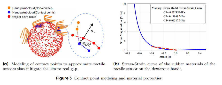 该研究提出了一种基于距离场的快速触觉仿真方法。通过并行正向运动学,计算密集的虚拟触觉单元阵列与物体表面之间的距离。这种方法不仅能够提供强化学习所需的高频信号,还保留了关键的接触信息(如接触力大小和受力加权接触中心)。这种设计在保证物理合理性的同时,极大地提升了仿真效率,使得策略能够在仿真中充分探索复杂的接触动力学。