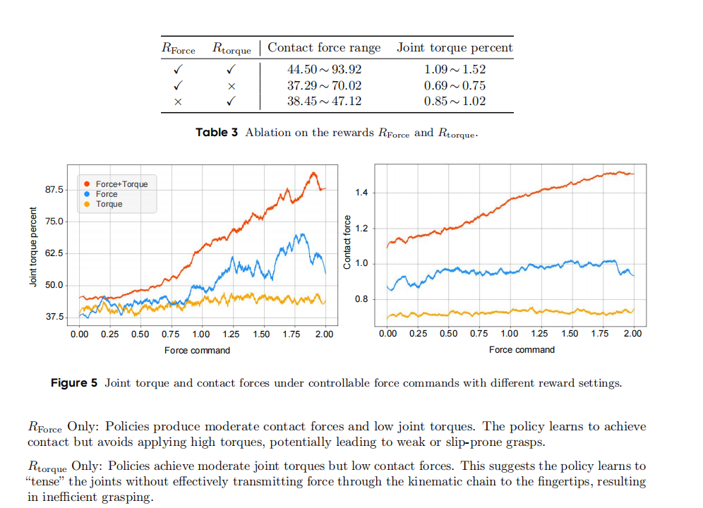 研究表明,结合接触力惩罚(R-force) 和关节力矩惩罚(R-torque) 的复合奖励函数是实现稳健力控的关键。仅惩罚接触力会导致关节力矩不足,抓取不稳;仅惩罚关节力矩则无法有效将力传递到指尖。两者的结合使得策略能够同时协调关节驱动和指尖接触,实现与指令高度线性相关的精准力控。