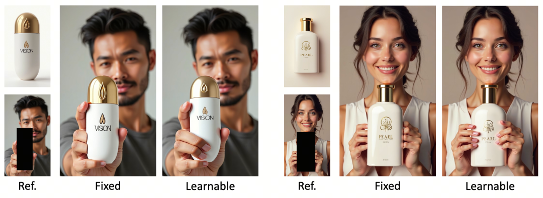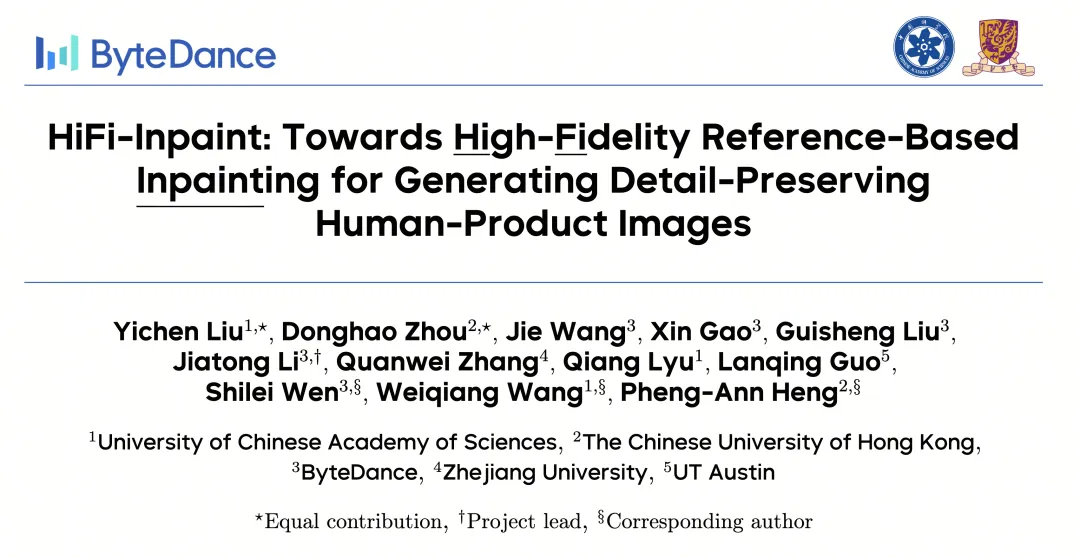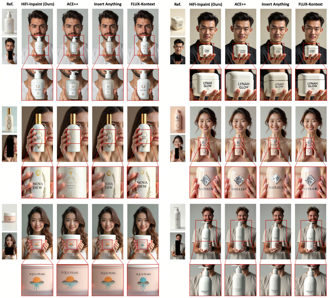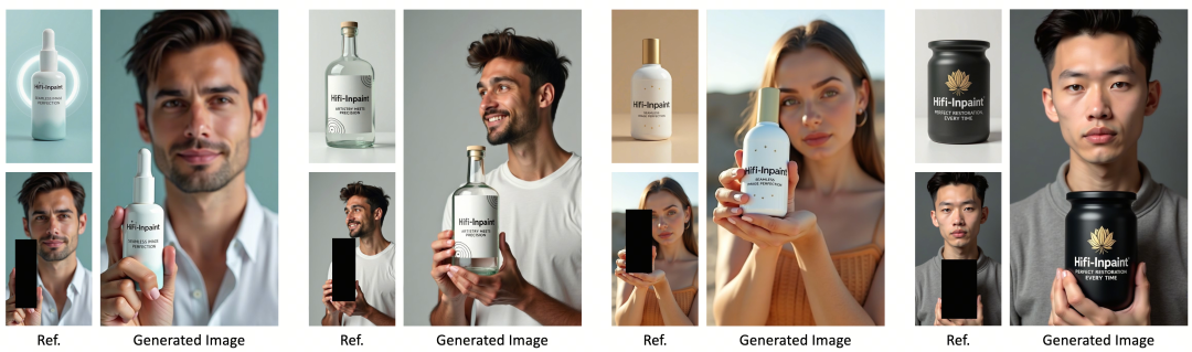 在 AIGC 领域,基于参考图像的图像修复(Reference-based Inpainting)一直是一项备受关注的核心任务,它旨在利用参考图像引导修复过程,生成视觉一致的内容。这一技术在广告营销和电商领域有着巨大的应用潜力,例如让 AI 自动生成 “真人手持或穿戴商品” 的展示图。然而,真实世界的商业应用对高保真度有着极其苛刻的要求。现有的模型在处理这类高标准任务时常常 “翻车”,尤其是在精细细节的保留上显得力不从心:品牌 Logo 扭曲、包装文字乱码、产品纹理丢失等问题,成为了阻碍技术落地的最大痛点。