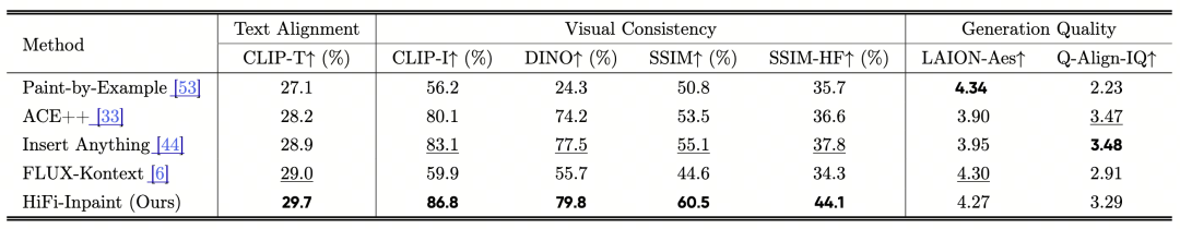 HiFi-Inpaint 在多项自动评估指标上取得最佳性能(上:合成测试数据,下:真实测试数据)。