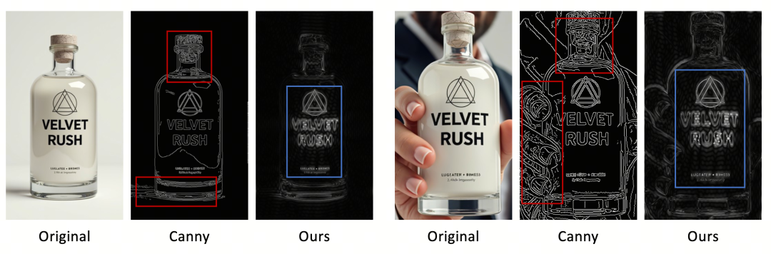 传统的 Canny 边缘检测会无差别地提取所有轮廓,引入大量无用的背景杂乱信息(如红框所示);而 HiFi-Inpaint 采用的特定频域滤波方法(Ours)能够精准高亮商品上的关键文字、Logo 与精细纹理(如蓝框所示),从而为 DAL 损失提供最纯净、最精确的像素级监督信号 。