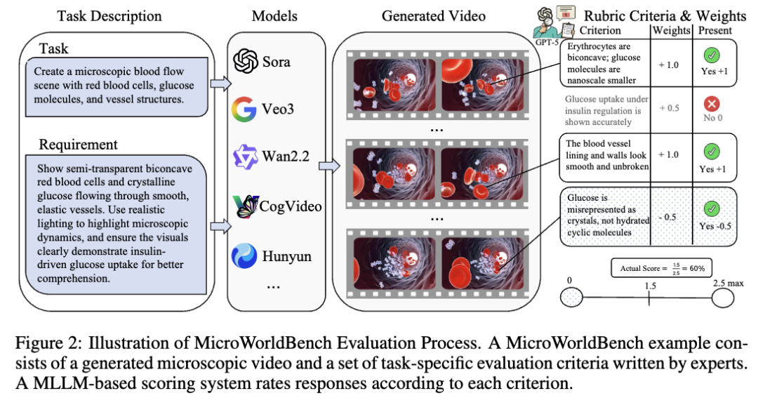 为了纠正视频生成模型在微观世界的 “信口开河”,研究团队提出了 MicroWorldBench — 这是全球首个针对微观生物模拟的量表化评测基准。