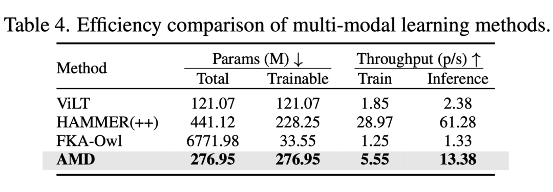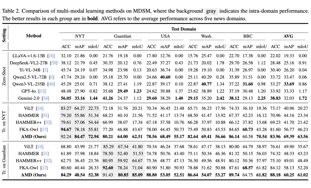 核心性能拉满:如表 2 所示,在 MDSM 跨域测试中,AMD 实现平均 88.18% ACC、60.25 mAP、61.02 mIoU 的顶尖成绩,全面碾压 ViLT、HAMMER++、FKA-Owl 等现有 SOTA 方案;
