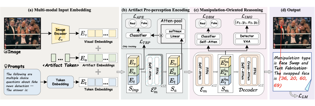 看懂“伪影”辨真假:创新设计伪影预感知编码机制,给模型装上“伪造雷达”,专门捕捉篡改内容留下的隐性痕迹,在保留海量世界知识的同时,注入极强的伪造感知能力。