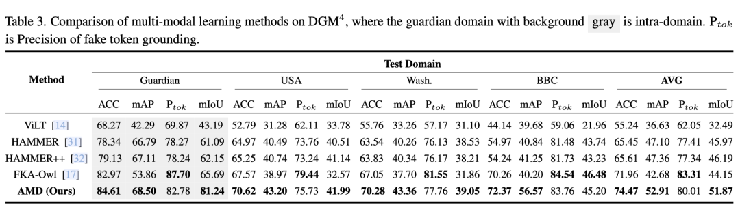超强泛化能力:如表 3 所示,在跨数据集 DGM4 测试中,AMD 依然拿下平均 74.47% ACC 的最优成绩,适配各类伪造场景,落地性拉满;