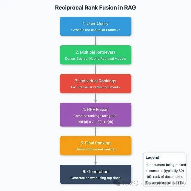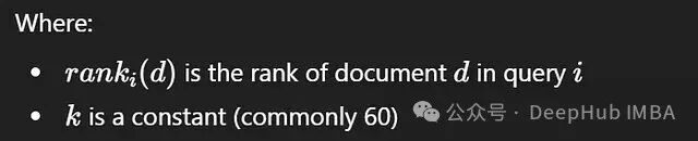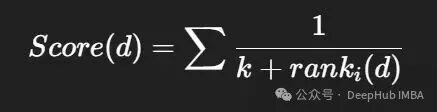 倒数排名融合(RRF)解决的正是这个问题。它不看原始相似度分数,而是根据文档在每路结果中的排名位置计算分数,公式如下: