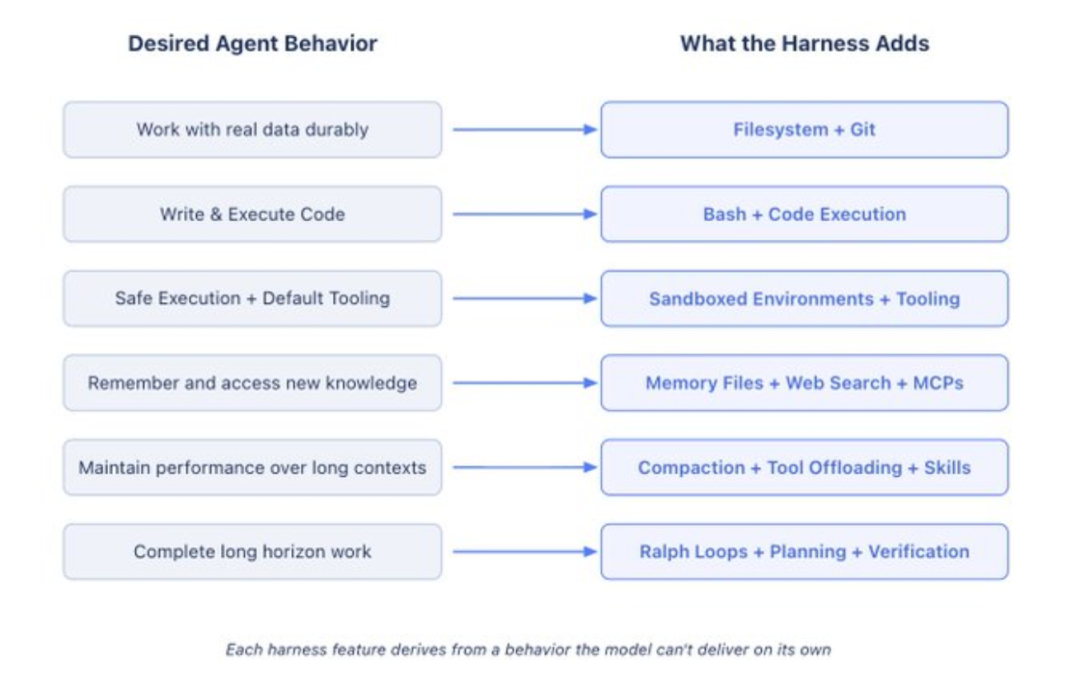 需要注意的是,模型本身并不会配置这些环境。Agent 在何处运行、拥有哪些工具、可以访问哪些资源、如何验证结果,全部属于 Harness 层的设计决策。