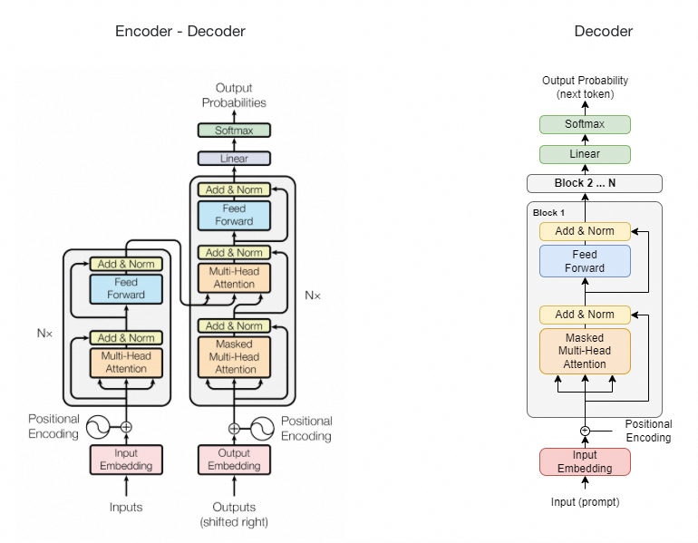 Transform 在某种意义上,实现了工程上的标准化,即注意力层、前馈层、残差连接和层归一化,降低了新模型开发的复杂度,促进了开源生态的繁荣。Transformer 那篇经典论文中架构是 Encoder-Decoder,而现在 LLM 几乎一边倒地导向 Decoder-only 架构,即下图右边部分。