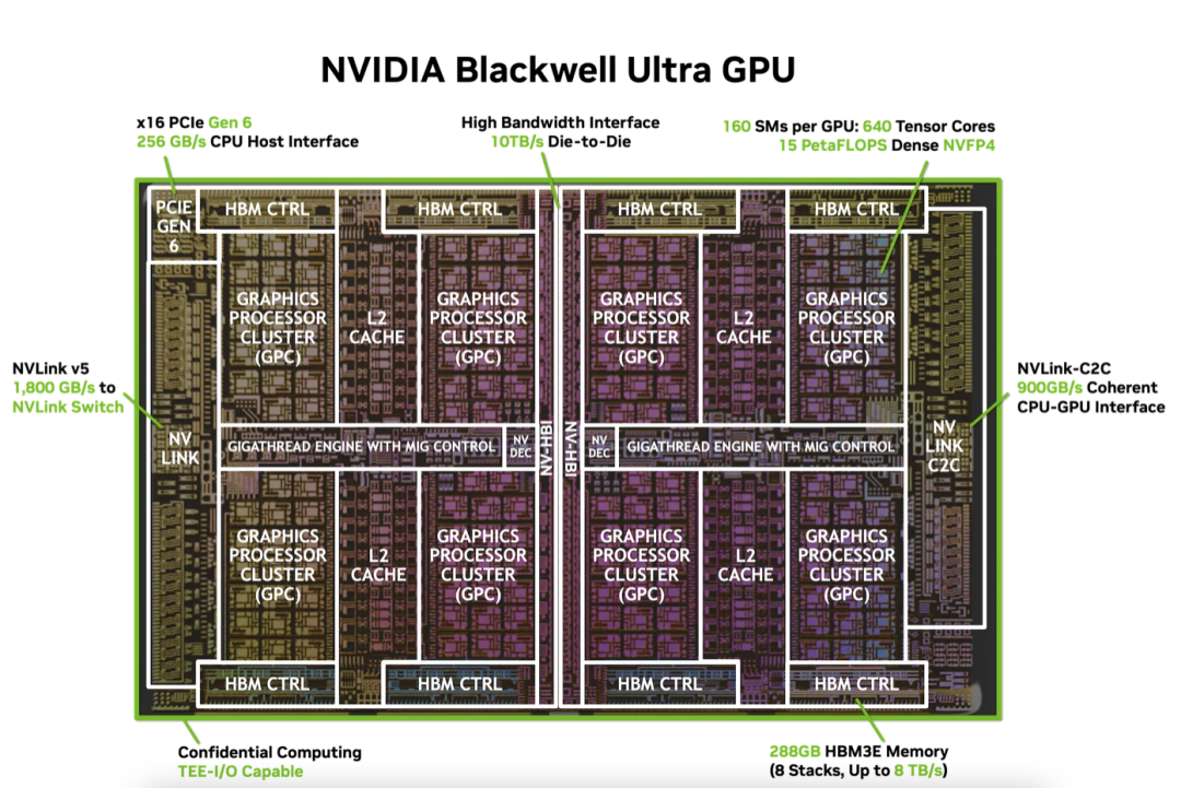 NV-HBI(High Bandwidth Interface) 10TB/s Die-to-Die B300 实际上是将两个芯片直接封装在一起,相对于后续通过 NVLink 串联显卡,可以获得更高的传输速度,甚至高于 HBM 显存带宽。这意味左边的 GPC 访问右边的显存,和访问左边的显存一样快(NUMA 透明),开发者不需要为此重写代码。