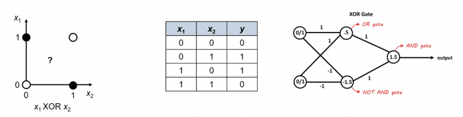 后来,研究者们又提出了多层感知机(MLP),即在输入层和输出层之间加入一个或多个隐藏层,比如为解决上述 XOR 问题,可以在中间加一层有 2 个神经元的隐藏层,包含两个神经元,上面是或门,权重是 [1,1],偏置是 0.5,即 sum 之后大于等于 0.5 则输出 1,同理下面与非门。输入