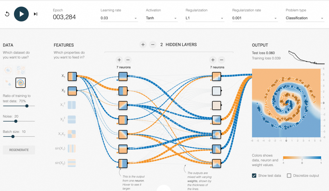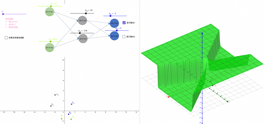 仅看上述通过 2 层网络解决 XOR 的例子,并不是很能够具象理解神经网络的层数以及每一层的个数对最终结果的影响。借助 TensorFlow Playground 以及可视化工具 GeoGebra,随机拖动或调整一些所谓超参数后,即便是一个仅有 2 层隐藏层的神经网络,也能产生复杂的空间折叠能力,解决复杂的分类问题。