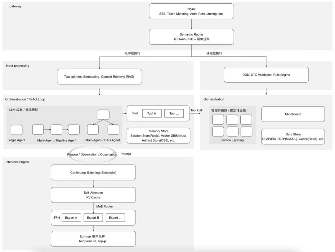 在过去分布式微服务架构中,本质是希望计算/存储分离,把所有“状态”强行剥离到底层存储服务中,从而让应用层变得彻底无状态,以期实现极致弹性。如果把问题再看得抽象一些,是把一个业务问题拆成很多个子问题,然后在各个子问题中再通过代码实现控制流,比如为处理一个逆向退款业务,研发需要写几千上万行代码来处理各种业务身份、状态机跳转、异常捕获和数据库事务等。但归根到底,过去架构的复杂性是人为设计的,可以进行逐层抽象和标准化而被理解。LLM 的复杂性来自数据涌现,推理过程是不被理解的黑盒。LLM 在训练阶段就已完成部分业务知识的内化,把复杂性隐藏在了模型权重中,Agent 的代码似乎变得像胶水一样,而且受基础模型能力迭代影响很大,有种变得越来越薄的趋势。