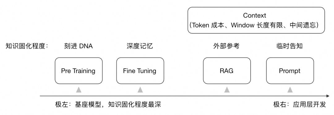 我们在讨论 AI 开发的时候,更多是站在 AI 应用开发的工程视角,而不是一个完整问题的解决视角。这其中细微差别在于,如果仅是站在应用开发视角,AI 开发 ≈ 组装 Prompt(当然组装也并非易事,如果加上 RAG,Memory 管理就变成了 Context,即 AI 开发 ≈ Context 开发,本质并无差别),而如果是站在完整的问题解决视角看,除 Prompt 外,还包括模型训练即 Pre Training 和 Fine Tuning。