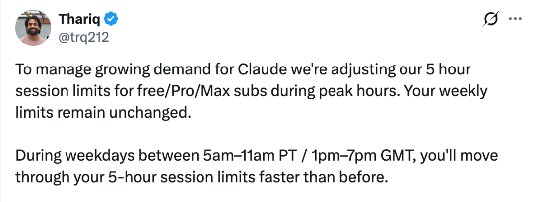 Anthropic 技术团队成员 Thariq Shihipar 在社交媒体发文称:“为了应对不断增长的 Claude 使用需求,我们正在调整免费版、Pro 和 Max 订阅用户在高峰时段的 5 小时会话限制。你们的每周总限额保持不变。”