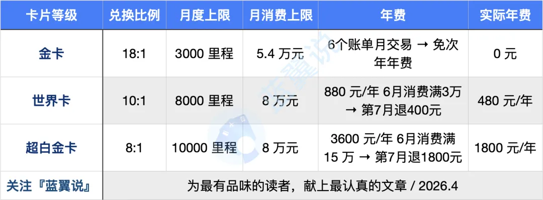 持有成本方面:金卡可以刷免,6 个账单月有交易即可免次年;世界卡年费 880 元,6 个月消费满 3 万元退 400 元,实际持有成本为 480 元;超白金卡年费 3600 元,6 个月消费满 15 万元退 1800 元,实际年费为 1800 元。