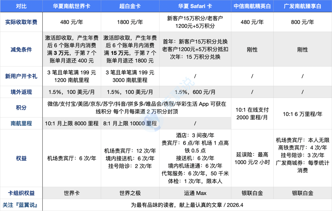 如果你并非南航重度用户,且消费场景偏向商旅,广发南航臻享白的综合回报率或许更高;如果你对南航里程压根没什么需求,只是想办一张华夏的好卡,那直接上华夏 Safari 卡的权益配置会让你更省心。