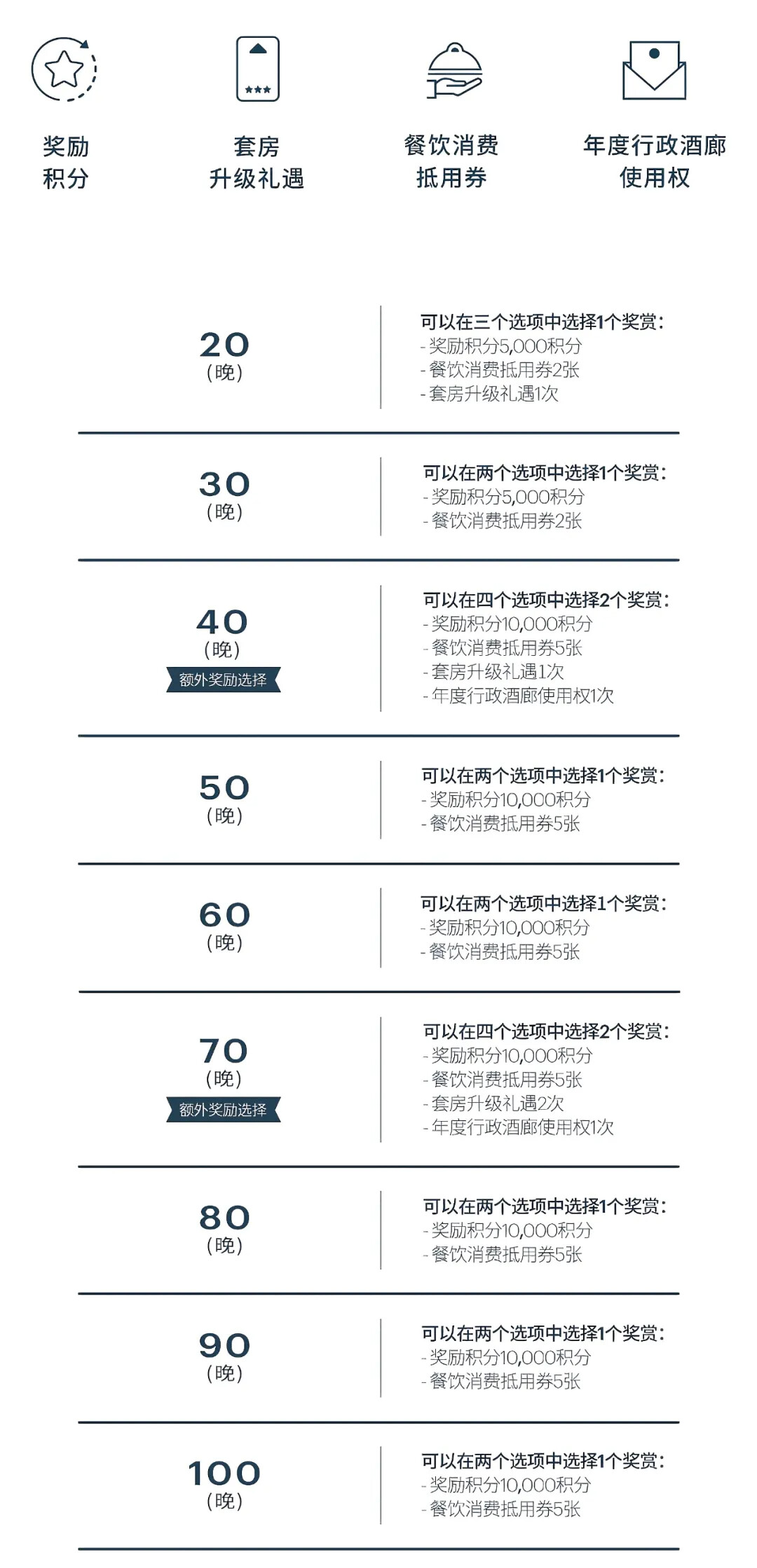 再看一下里程碑奖励,从20晚开始到100晚,每完成10晚都会有里程碑奖励,IHG自己划的重点,40晚和70晚可以选择行政酒廊,40晚是个必须到达的分水岭,否则没有必要上IHG的车。