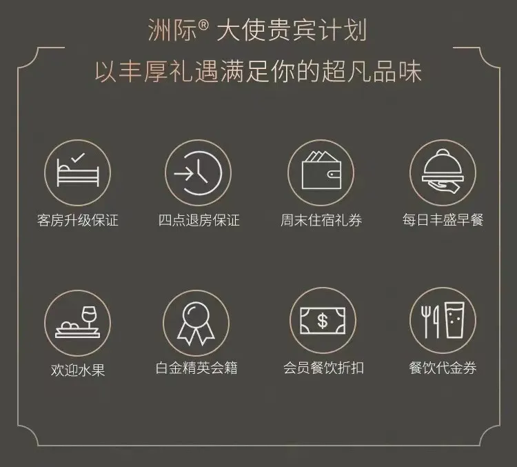 IHG在双会员体系下并行:优悦会(IHG ONE Rewards)和洲际大使(Intercontinental Ambassador)。优悦会的会员待遇适用于IHG旗下所有酒店,而洲际大使给到的,除赠送优悦会白金卡外,其他权益只有在入住洲际、六善酒店时才可以享受: