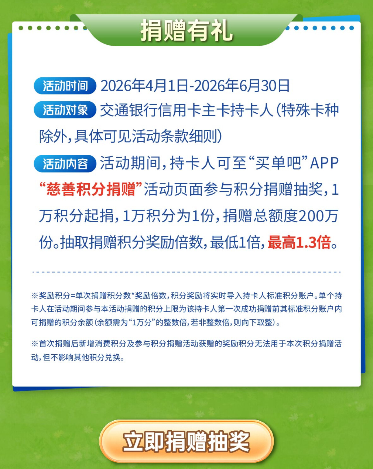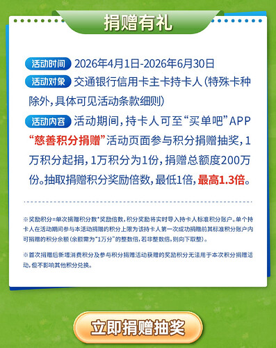 交行信用卡慈善积分捐赠活动来袭!捐积分抽奖,最高返还1.3倍积分,速来参与,手慢无!