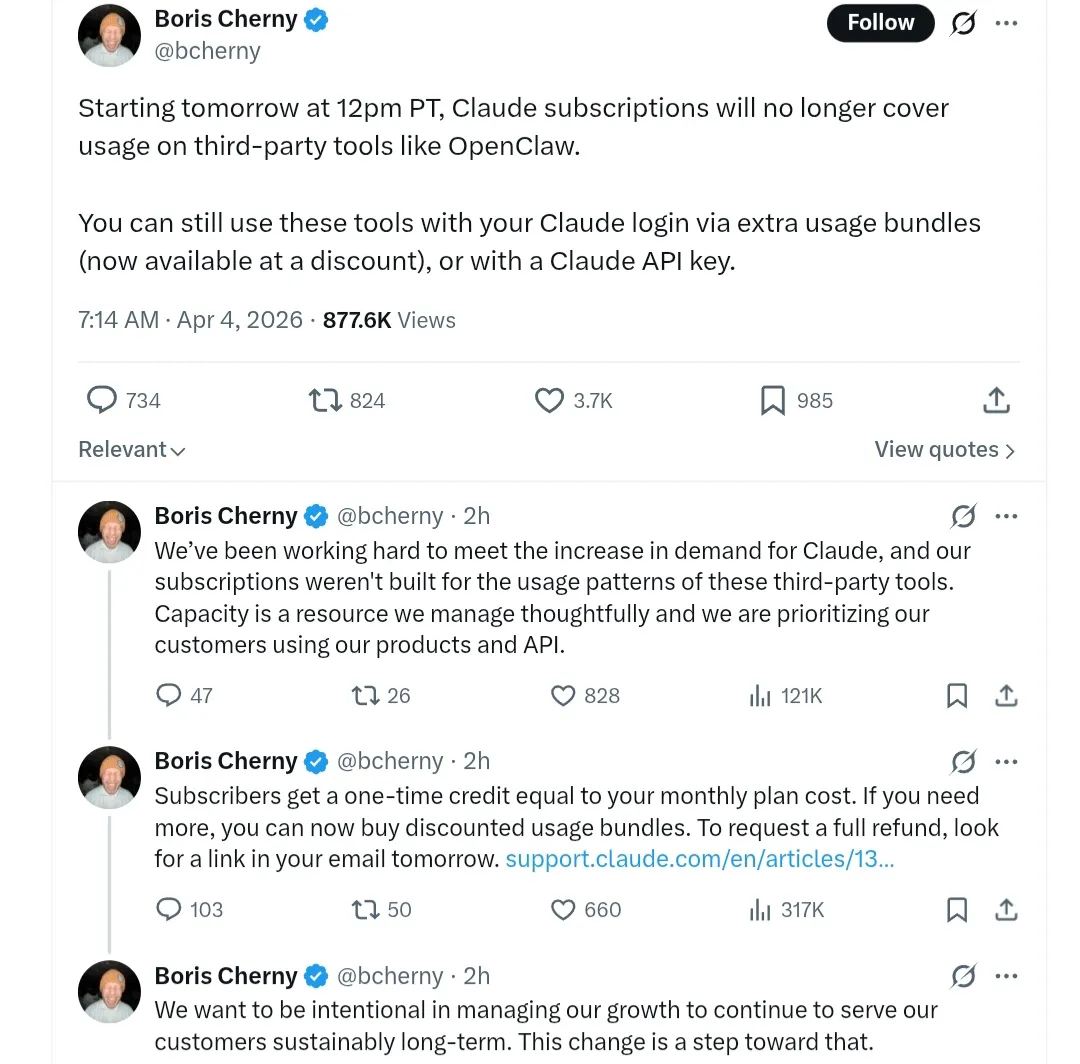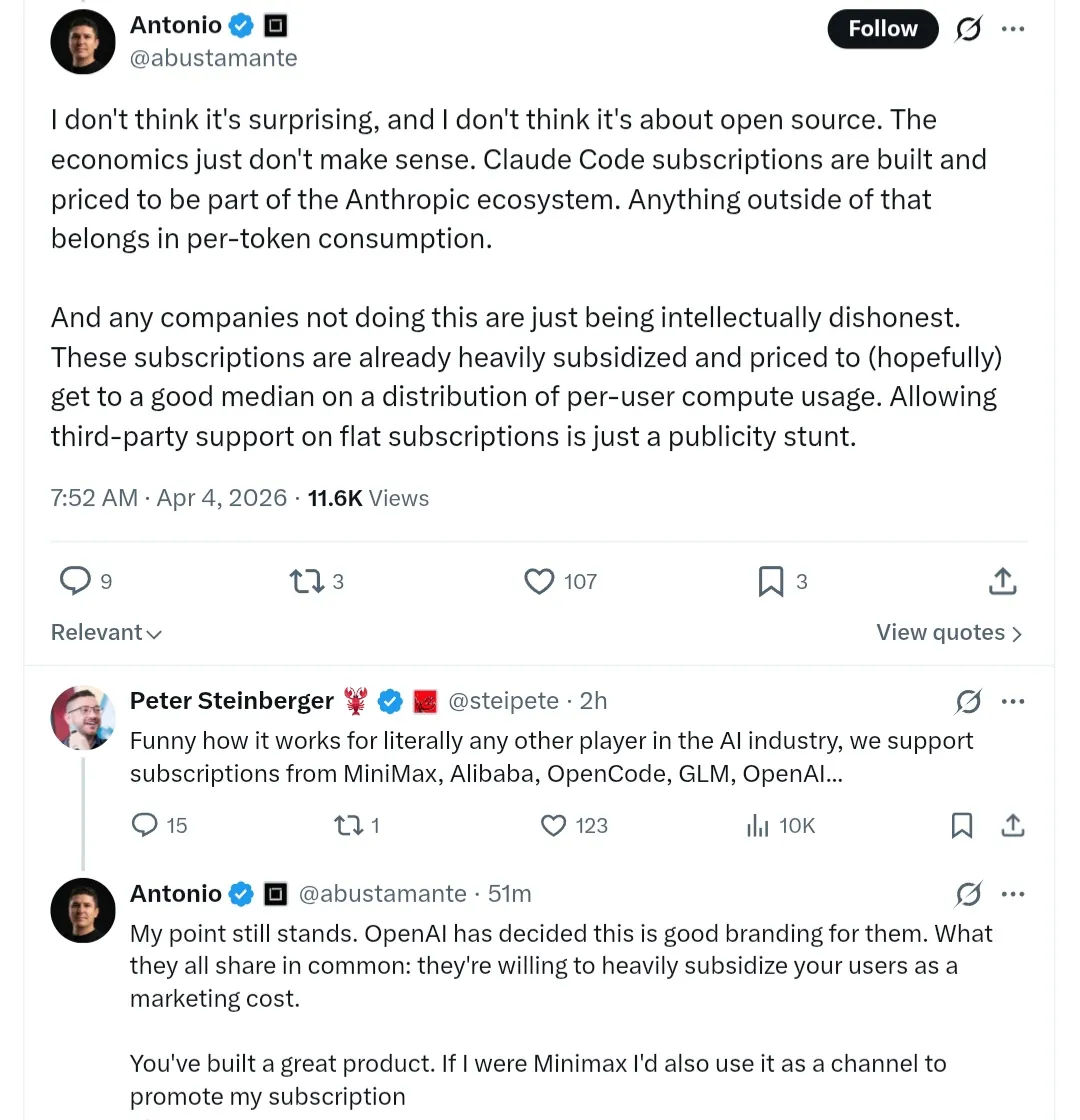 Anthropic停止补贴OpenClaw等第三方工具,引发社区关于开源、商业模式和平台责任的讨论。