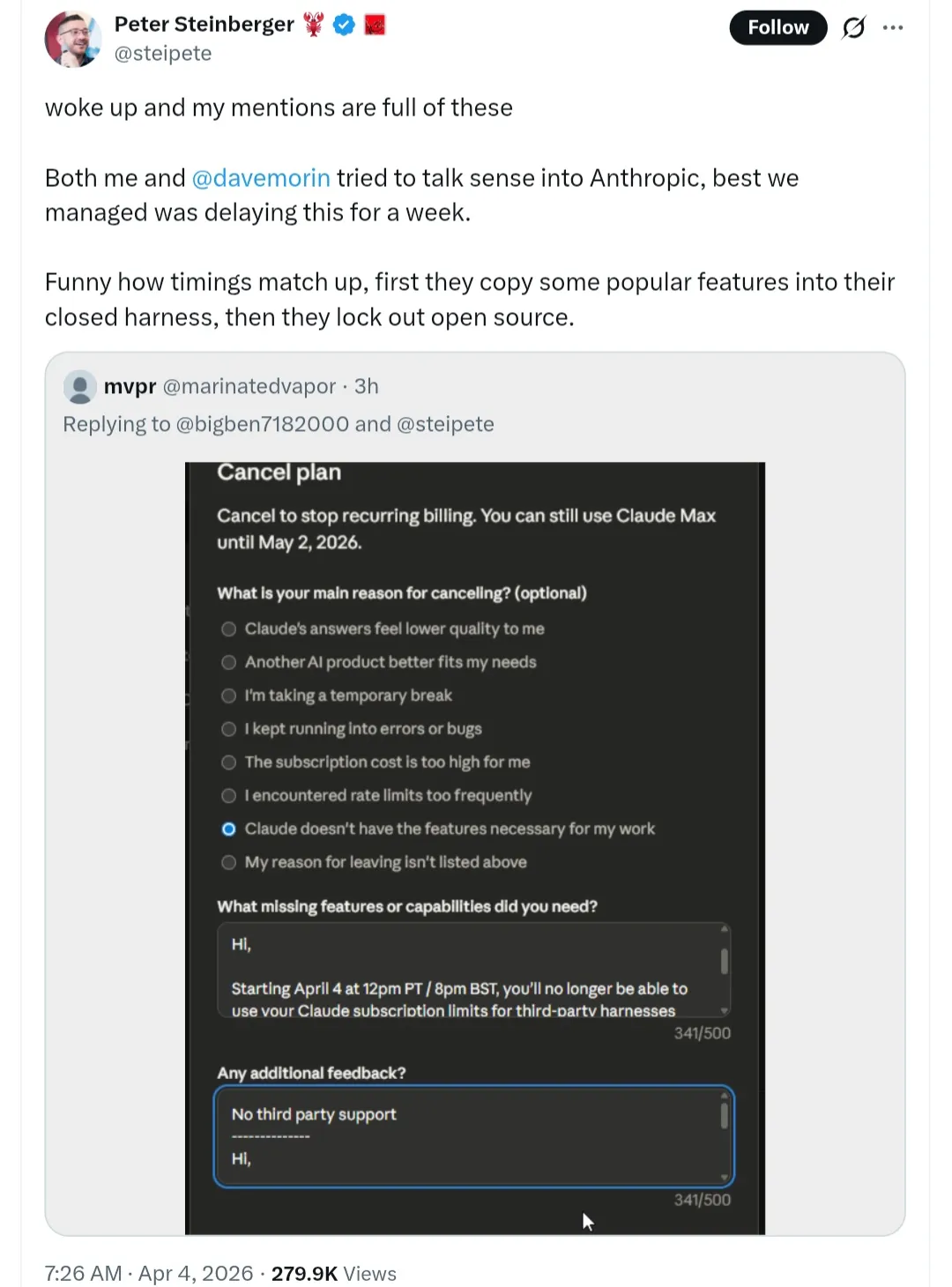 而此事官宣后,OpenClaw 创始人 Peter Steinberger 在 X 上透露,“我和 OpenClaw 董事会成员 Dave Morin 曾尽力去说服 Anthropic,但最终只成功将此事推迟了一周。”同时,他吐槽道,“时间点真是巧合,他们先是将一些热门功能复制到他们的封闭框架中,然后又将开源软件拒之门外。”
