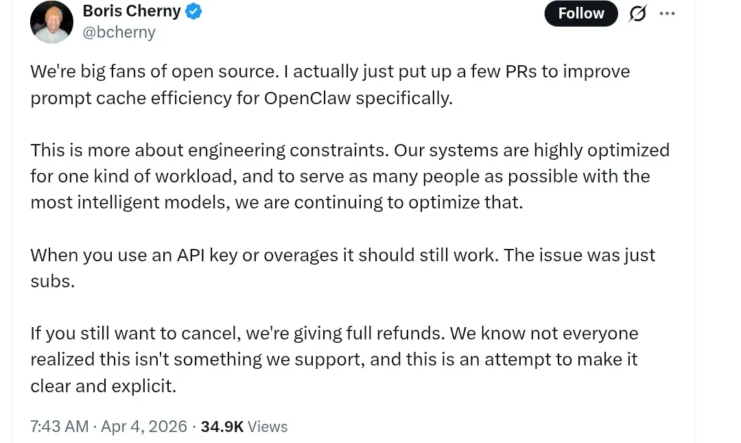 对此,Cherny 回应称,“我们非常支持开源。事实上,我刚刚提交了一些 PR,专门用于提升 OpenClaw 的提示缓存效率。这更多是出于工程方面的限制。我们的系统针对特定类型的工作负载进行了高度优化,为了尽可能多地为用户提供最智能的模型,我们正在持续优化。即使您使用 API 密钥或超出套餐限额,系统应该仍然可以正常运行。问题仅出现在订阅服务上。如果您仍然想要取消订阅,我们将全额退款。我们知道并非所有人都意识到我们不支持这种做法,因此我们尝试明确说明这一点。”