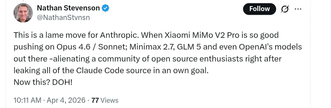 不少网友评价道,“Anthropic 的这一举动实在令人失望,在泄露了 Claude Code 的所有源代码后,又自毁前程地疏远了开源爱好者群体。”