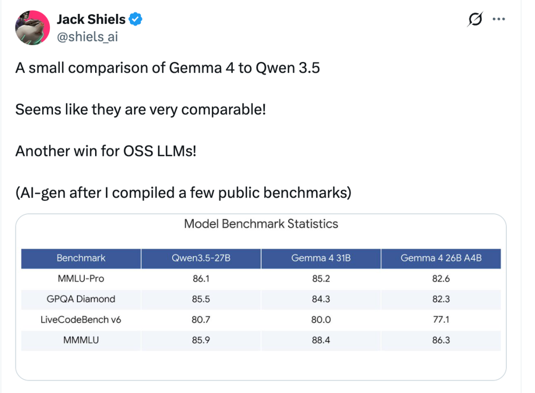 不过,有网友自己测算结果 Qwen3.5-27B 要略优于 Gemma 4 31B。